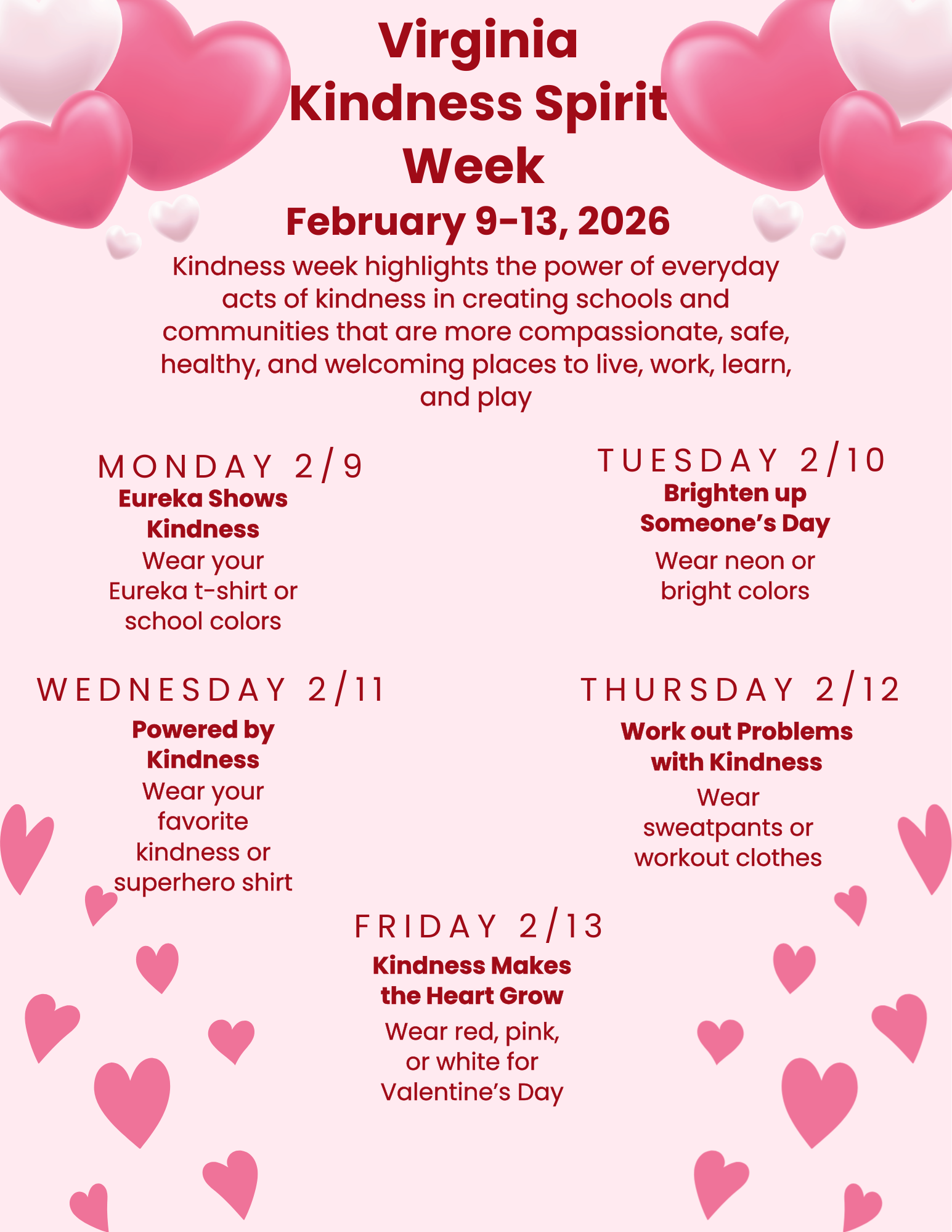 Kindness week highlights the power of everyday acts of kindness in creating schools and communities that are more compassionate, safe, healthy, and welcoming places to live, work, learn, and play. Click here to see the dress days for kindness week!